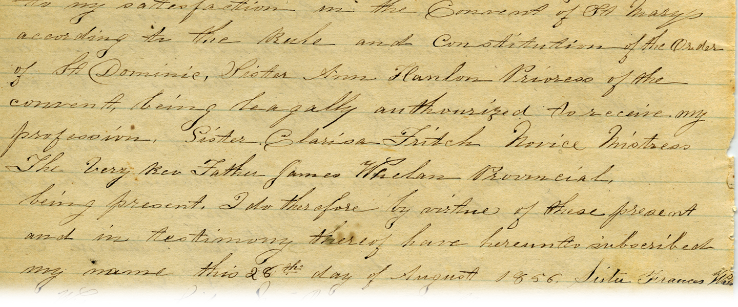 Mother Frances truly modeled a commitment to poverty, chastity, and obedience, as well as an enduring reliance on the Providence of God and on the fatherly concern of St. Dominic for his daughters. As one sister wrote of Mother Frances in 1935, she was “a most deeply spiritual woman possessing superior qualities of mind and heart, broad vision, untiring energy, and an indomitable will.” Without her guidance and commitment and that of Mother Ann Hanlon, St. Cecilia would have ceased to exist less than a decade after its founding.