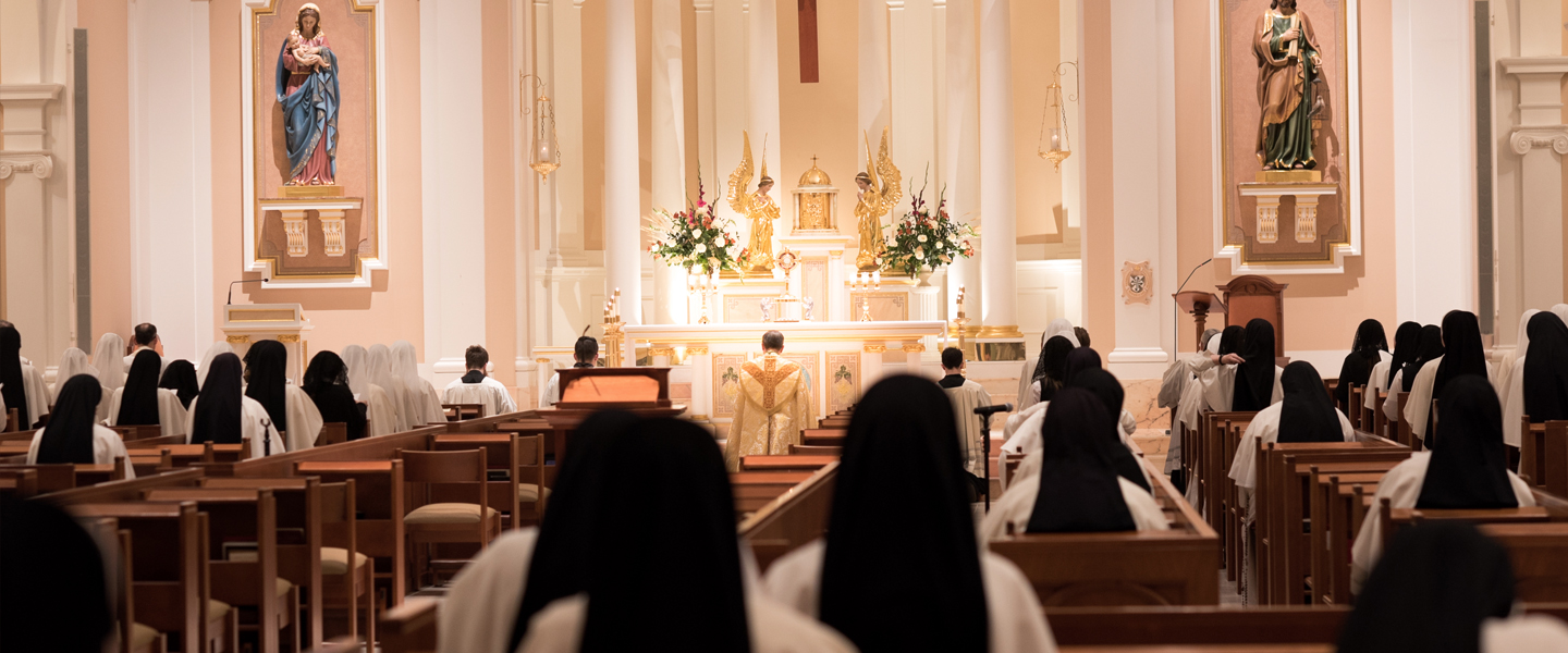 The devotion begins with exposition of the Blessed Sacrament, Benediction, and the Litany of the Saints. A procession follows, with the Blessed Sacrament accompanied by incense. The procession recalls Christ’s presence with us during our earthly journey. During the procession, the Lord in the monstrance is held high by the priest, recalling the Lord’s prophecy, “The Son of Man must be lifted up” (John 3:14). For forty hours, spread over three days, the Blessed Sacrament is exposed on the altar. On the third day, solemn Vespers, another procession, the litany and a closing benediction completes the celebration. Each year, priests from the Nashville Diocese are invited to the Motherhouse to share in this time of prayer and celebration with the community in praise and thanksgiving for so great a gift.